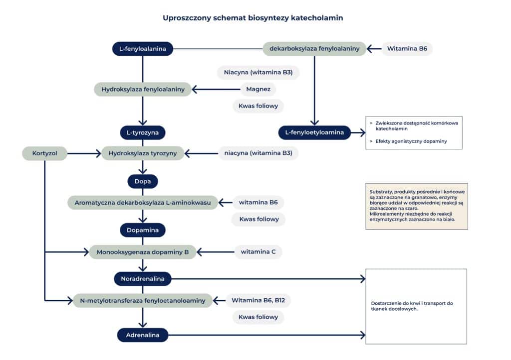 Katecholaminy wytwarzane przez nadnercza powstają z aminokwasu L–tyrozyny. To pierwszy substrat, którego nie może zabraknąć tym gruczołom. Następnie ulega ona przekształceniu do DOPA w mitochondriach, co wymaga witaminy B3. DOPA podlega dekarboksylacji do dopaminy z pomocą witaminy B3 i metylofolianu (5-MTHF). Przy udziale witaminy C dopamina ulega utlenieniu do noradrenaliny, która w odpowiednich komórkach np. rdzenia nadnerczy, serca, czy mózgu ulega przekształcaniu do adrenaliny. Tutaj z kolei potrzebna jest witamina B6, B12 i metylowany kwas foliowy.