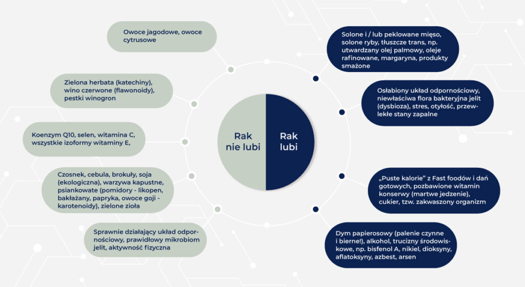 Zestawienie czynników sprzyjających kancerogenezie oraz czynników zmniejszających prawdopodobieństwo wystąpienia choroby nowotworowej przedstawia poniższy rysunek: