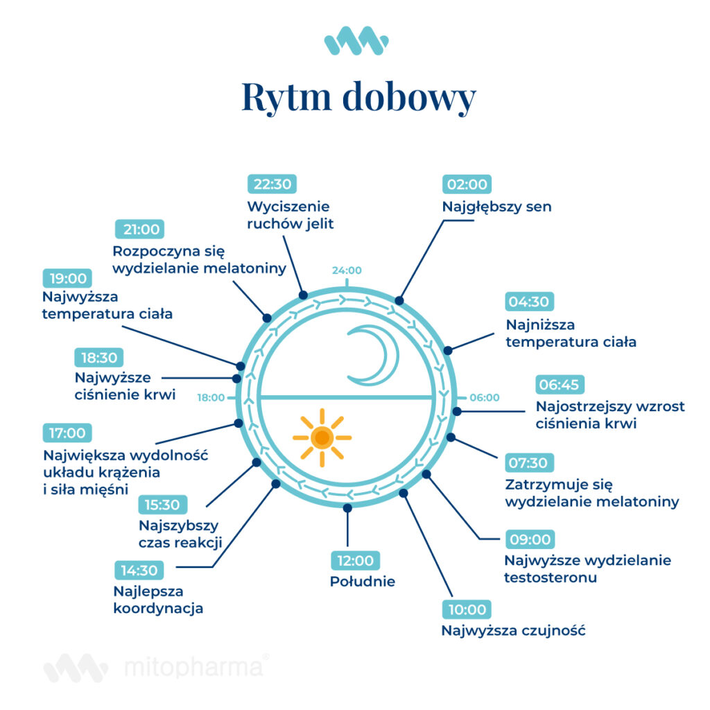 Rytm dobowy określany jest jako nasz wewnętrzny zegar biologiczny. Dzięki niemu organizm niejako organizuje swoją pracę w cyklu 24 godzinnym1. Rytm ten pomaga kontrolować cykl snu i czuwania, temperaturę ciała i produkcję hormonów1. Jednym z regulatorów cyklu dobowego jest właśnie melatonina. Jest pochodną aminokwasu tryptofanu i neuroprzekaźnika serotoniny2. Produkowana jest w szyszynce w mózgu oraz w innych tkankach m.in. w żołądku. Jej poziom we krwi zmienia się zależnie od pory dnia: w nocy we krwi jest od 10 do 15 razy więcej melatoniny niż w ciągu dnia, co ułatwia nam zasypianie3. Natomiast spadek jej poziomu w godzinach porannych i jednoczesny wzrost poziomu kortyzolu pomaga nam się obudzić.