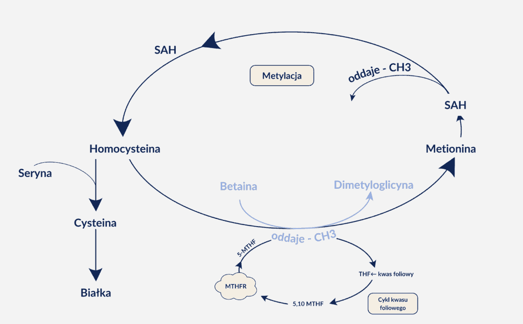 - eliminację nadmiaru homocysteiny oraz utrzymanie jej prawidłowego poziomu (homocysteina to niebiałkowy aminokwas siarkowy, który w nadmiarze prowadzi do uszkodzeń naczyń krwionośnych oraz zaburzeń funkcjonowania układu nerwowego, np. depresji czy chorób neurodegeneracyjnych. W normalnych warunkach dzięki tzw. remetylacji (czyli ponownego przyłączenia grup metylowych) homocysteina ulega przemianie w L-metioninę. Czym są te normalne warunki?