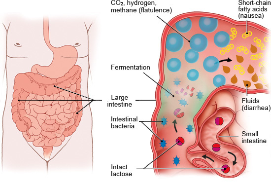 Niestrawiona laktoza zaczyna fermentować, a po dotarciu do okrężnicy obecne w niej bakterie wytwarzają krótkołańcuchowe kwasy tłuszczowe i gazy – głównie wodór, dwutlenek węgla i metan – powodując wzdęcia.
