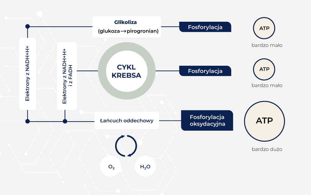 ATP uzyskujemy zarówno na drodze glikolizy (rozkładu glukozy), jak również w cyklu Krebsa. Jednak najbardziej wydajnym źródłem energii jest dla komórek mitochondrialny łańcuch oddechowy, który w dużym uproszczeniu jest niczym innym jak kontrolowaną enzymatycznie serią reakcji z mieszaniną piorunującą, podczas której wodór łączy się z tlenem, dając wodę oraz – jako produkt uboczny reakcji – energię.