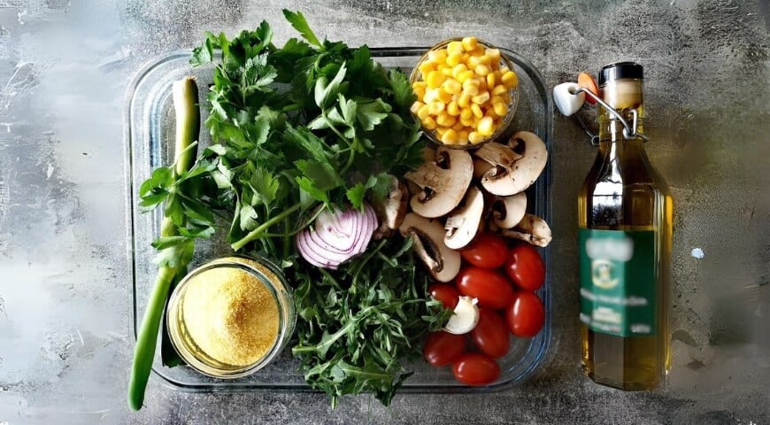 Na dużej patelni rozgrzej oliwę z oliwek i podsmaż na niej pokrojoną drobno cebulę z przyprawami, dodaj pieczarki, podsmaż, a następnie dodaj kukurydzę i pokrojone na cząstki pomidory koktajlowe. Krótko podduś pod przykryciem. Zestaw z ognia.