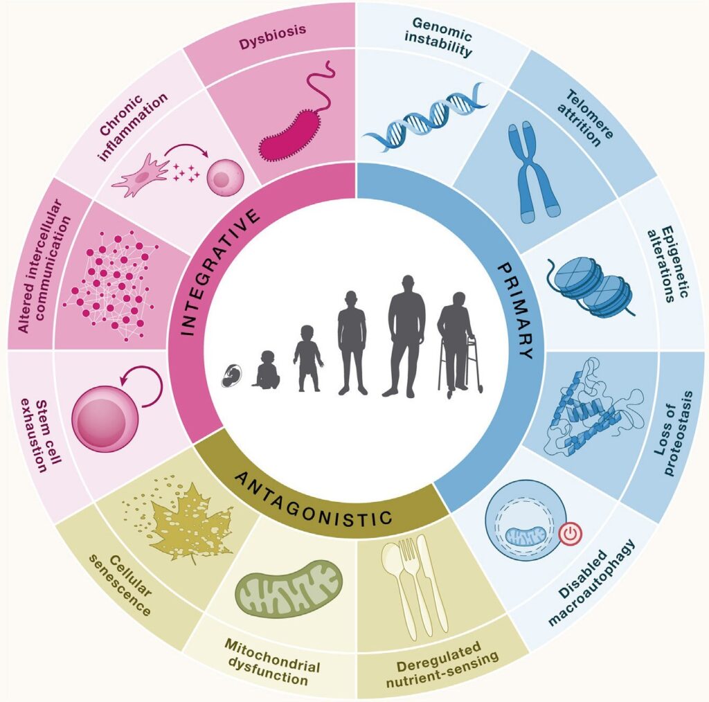 Choroby te rozwijają się w wyniku zmian na poziomie komórkowym, takich jak niestabilność genomu, ubytek telomerów, dysbioza, utrata proteostazy, spadek intensywności autofagii, zaburzone rozpoznawanie składników odżywczych, dysfunkcje mitochondriów, starzenie się komórek, zubożenie zasobów komórek macierzystych, zaburzenia komunikacji międzykomórkowej, przewlekłe stany zapalne i zmiany epigenetyczne, które obecnie uznaje się za cechy charakterystyczne starzenia się (Rys. 1).