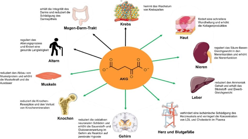 AKG jest wskazany we wszystkich przewlekłych chorobach neurologicznych, takich jak choroba Alzheimera, choroba Parkinsona itp. AKG ulega przekształceniu w glutaminian w procesie aminacji. Dekarboksylacja AKG w obecności witaminy B6 powoduje jego przekształcenie w neuroprzekaźnik GABA o działaniu inhibitorowym. W ten sposób AKG poprawia pamięć długotrwałą i krótkotrwałą. Rys. 3 podsumowuje pozytywne oddziaływania AKG na poszczególne narządy ciała i ogólny stan zdrowia.
