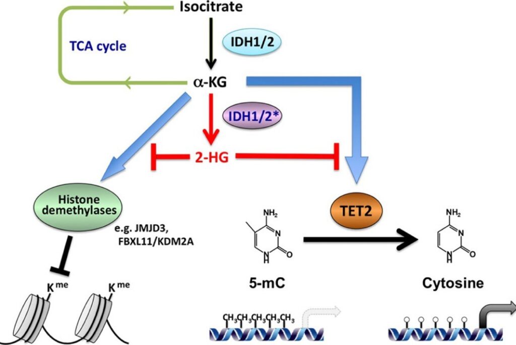 Enzymy „dehydrogenazy izocytrynianowej” (IDH1 i IDH2), które katalizują powstawanie AKG, są często w komórkach nowotworowych zmutowane, co prowadzi do powstawania w miejsce AKG „2-hydroksyglutaranu” (2HG). 2-hydroksyglutaran konkurencyjnie hamuje zależne od AKG dioksygenazy i przyczynia się do rozwoju nowotworu. Dlatego w tkankach nowotworowych często obserwuje się wzrost metylacji DNA (Rys. 4).