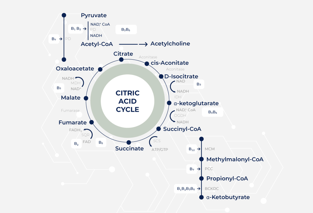 Szczególnymi kofaktorami niebiałkowymi są koenzymy reprezentowane przez aktywne formy witamin. Zwiększają zdolność enzymów do przeprowadzania różnorodnych reakcji w tym metabolizowania pożywienia i wytwarzania z niego energii3. W tej roli witaminy z grupy B są kluczowe dla metabolizmu i nie może ich zabraknąć w naszej diecie. Przykładem jest bioaktywna forma witaminy B5 – niezbędnej do funkcjonowania ponad 140 enzymów kontrolujących przemiany białek4. Ponadto bierze udział w tworzeniu koenzymu A (CoA)2. Witaminy B1 i B2 są konieczne do wytwarzania energii z pirogronianu pochodzącego z węglowodanów, natomiast do przekształcenia ciał ketonowych pochodzących z przemian tłuszczy wymagane są dodatkowo: witaminy B3, B5 i B12. Bez nich szlaki naszego metabolizmu są hamowane, przemiany zwalniają, a poziom energii spada.