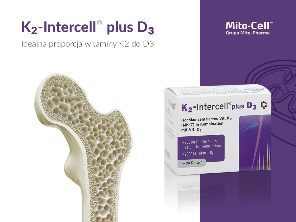 Wiemy już jak ważna jest równowaga między witaminą D3 i wapniem. Jednak to, czy wapń zostanie wykorzystany do budowy kości zależy od jeszcze jednego czynnika – witaminy K2. To właśnie ona kierunkuje działanie wapnia i witaminy D36. Witamina K za pomocą wapnia reguluje procesy krzepnięcia krwi oraz zachowania zdrowych kości i zębów. Gdy brakuje witaminy K, poziom wapnia może wzrosnąć i wapń zacznie gromadzić się w tkankach miękkich lub tętnicach. Witamina K2 aktywuje białko, które reguluje gospodarkę wapnia zapobiegając jego odkładaniu w tętnicach i tkankach miękkich. Tym białkiem jest MPG (Matrix GLA Protein). Witamina K2-MK7 zwiększa produkcję oraz aktywność tego białka. Przy prawidłowym poziomie witaminy K2-MK7 jony wapnia dostarczane są do kości, a przy niedoborze K2 jony wapniowe dostają się do tętnic, prowadząc do rozwoju blaszki miażdżycowej. Kiedy przyjmujemy wysokie dawki witaminy D nasze ciało wytwarza zależne od witaminy K2 białko. Stąd biorąc witaminę D3 zwiększa się jednocześnie nasze zapotrzebowanie na witaminę K2. Dopiero wspólna praca witamin K2 i D3 przyczynia się do zdrowia naszych kości, serca i układu krążenia. Z tego powodu zaleca się przyjmowanie witaminy D3 wraz z witaminą K2-MK7, która pomaga wykorzystać wapń. Zatem odpowiednie dostarczanie z dietą lub suplementacja witaminy K2 wzmacnia nie tylko nasze kości, ale także chroni nas przed powstawaniem blaszki miażdżycowej, zwapnieniem tętnic i niewydolnością krążenia.