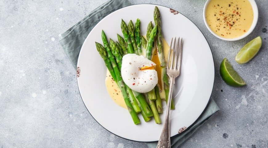 Pomysł na pyszne śniadanie białkowo-tłuszczowe z jajkami i szparagami oraz szynką parmeńską.