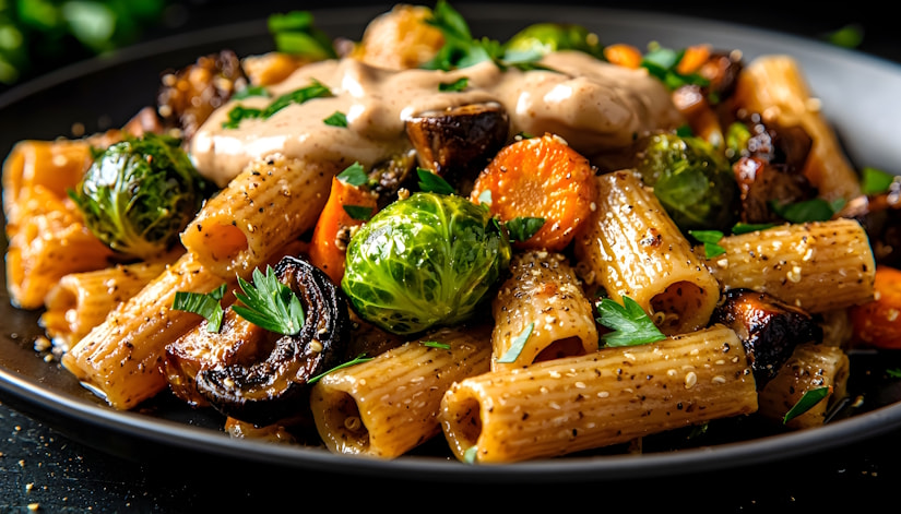 Makaron orkiszowy z pieczoną brukselką, kurkami i kremowym sosem parmezanowym
