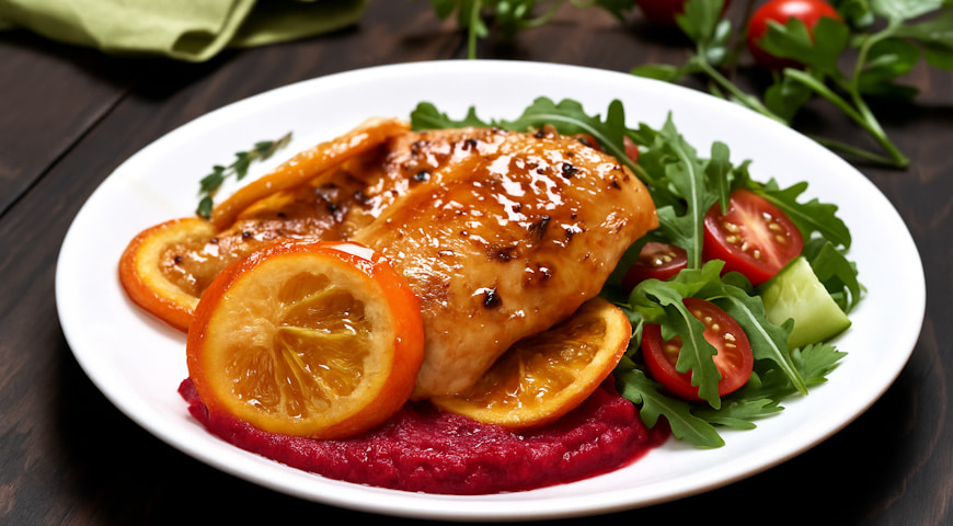 Indyk w pomarańczach z puree buraczano-batatowym i sałatką z rukoli