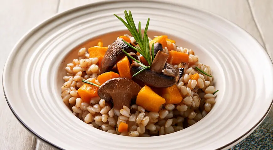 Kasza pęczak z pieczoną dynią, borowikami i rozmarynem