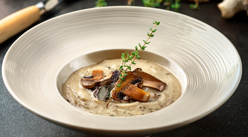 Krem z borowików z nutą tymianku cytrynowego, oliwą truflową i parmezanem
