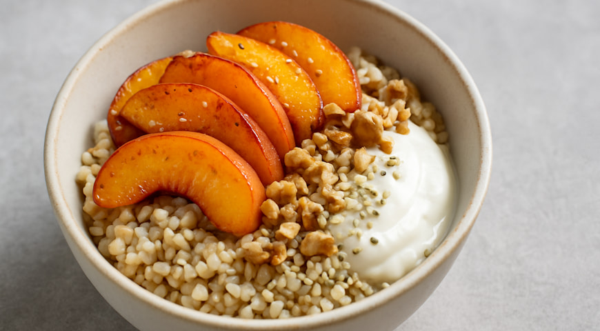 Deser z kaszy gryczanej niepalonej z karmelizowanymi brzoskwiniami, orzechami włoskimi i miodem lipowym
