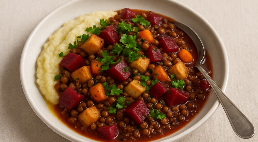 Gulasz z topinamburu, soczewicy i kiszonego buraka z czarnuszką i natką